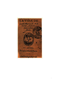 Esta es una novela española anónima, escrita en primera persona en estilo epistolar (como una sola y larga carta). Su edición conocida más antigua data de 1554. Narra de forma autobiográfica la vida de un niño, Lázaro de Tormes, en el siglo XVI. Es considerada precursora de la novela picaresca por elementos como el realismo, la narración en primera persona, la estructura itinerante y la ideología moralizante y pesimista.