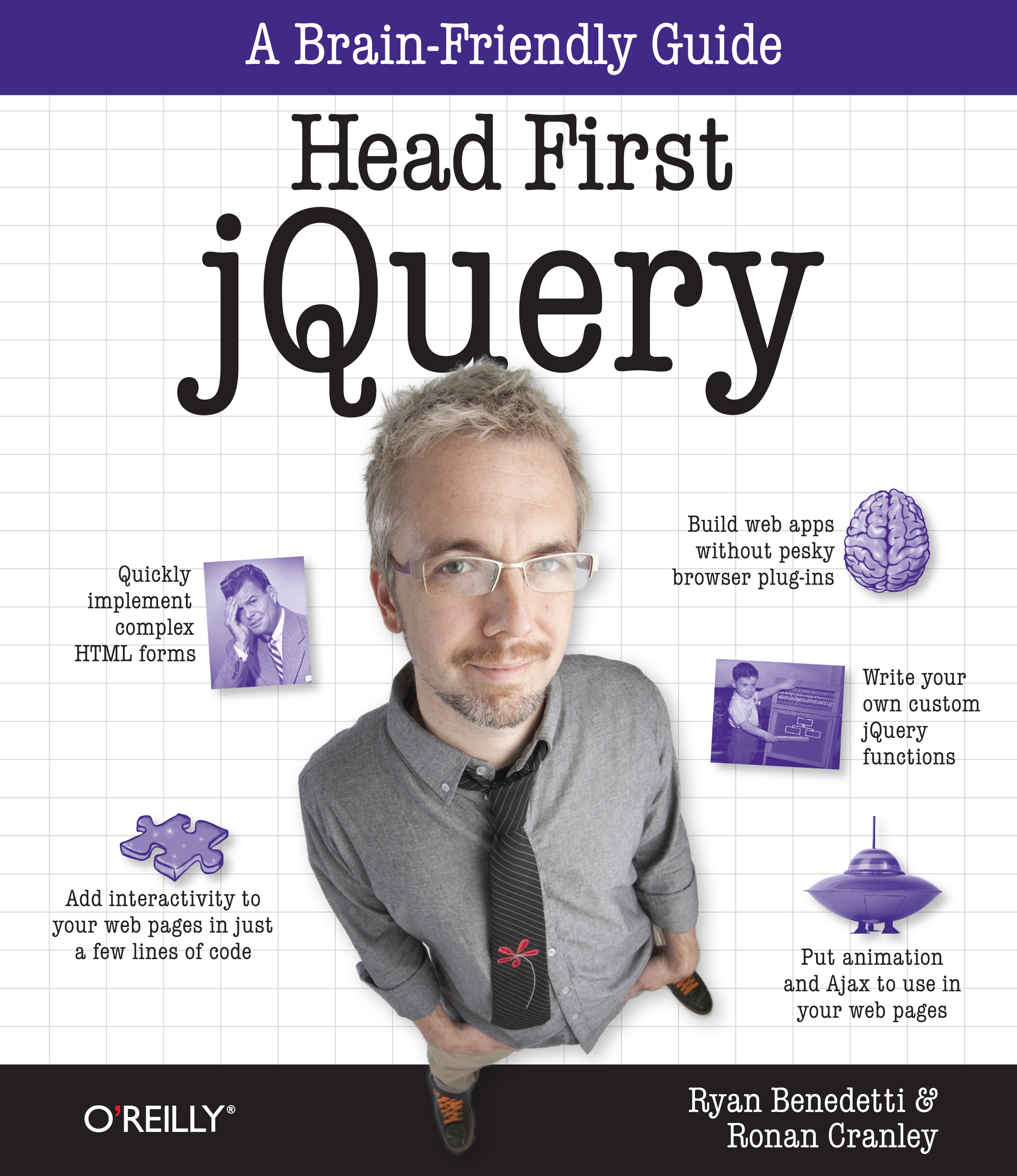 Want to add more interactivity and polish to your websites? Discover how jQuery can help you build complex scripting functionality in just a few lines of code. With Head First jQuery, you'll quickly get up to speed on this amazing JavaScript library by learning how to navigate HTML documents while handling events, effects, callbacks, and animations. By the time you've completed the book, you'll be incorporating Ajax apps, working seamlessly with HTML and CSS, and building your own plug-ins. If you want to learn-and understand-how to create interactive web pages, unobtrusive script, and cool animations that don't kill your browser, this book is for you. * Use jQuery with DOM to overcome the limitations of HTML and CSS * Learn how jQuery selectors and actions work together * Write functions and wire them to interface elements * Use jQuery effects to create actions on the page * Make your pages come alive with animation * Learn how use jQuery with the new HTML5 elements * Build interactive web pages with jQuery and Ajax * Create plug-ins to handle reusable functions * Build forms and reports in web applications