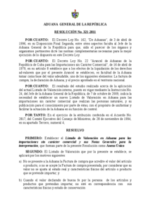 res321-11 Listado de Valoración en Aduana para las importaciones sin carácter comercial y sus Notas Generales para la interpretación