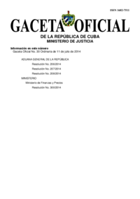 Gaceta Oficial No. 30 Ordinaria de 11 de julio de 2014 Contine las nuevas resoluciones para importacion por aduana con caracter no comercial. ADUANA GENERAL DE LA REPÚBLICA Resolución No. 206/2014 Resolución No. 207/2014 Resolución No. 208/2014 Ministerio de Finanzas y Precios Resolución No. 300/2014