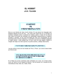 Esta es una historia de hace mucho tiempo. En esa época los lenguajes eran bastante distintos de los de hoy... Las runas eran letras que en un principio se escribían mediante cortes o incisiones en madera, piedra, o metal. En los días de este relato los Enanos las utilizaban con regularidad, especialmente en registros privados o secretos. Si las runas del Mapa de Thror son comparadas con las transcripciones en letras modernas, no será difícil reconstruir el alfabeto (adaptado al inglés actual), y será posible leer el título rúnico de esta página. Desde un margen del mapa una mano apunta a la puerta secreta, y debajo está escrito: